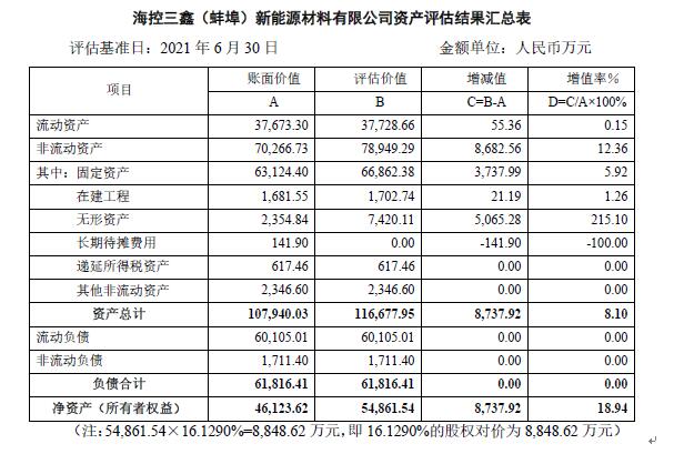 蚌埠投資集團有限公司擬轉讓所持??厝危ò霾海┬履茉床牧嫌邢薰竟蓹嗟男袨橐呀?jīng)市國資委批復同意。根據國有資產(chǎn)管理及資產(chǎn)評估有關(guān)規定,現對所涉及的資產(chǎn)評估結果進(jìn)行公示。